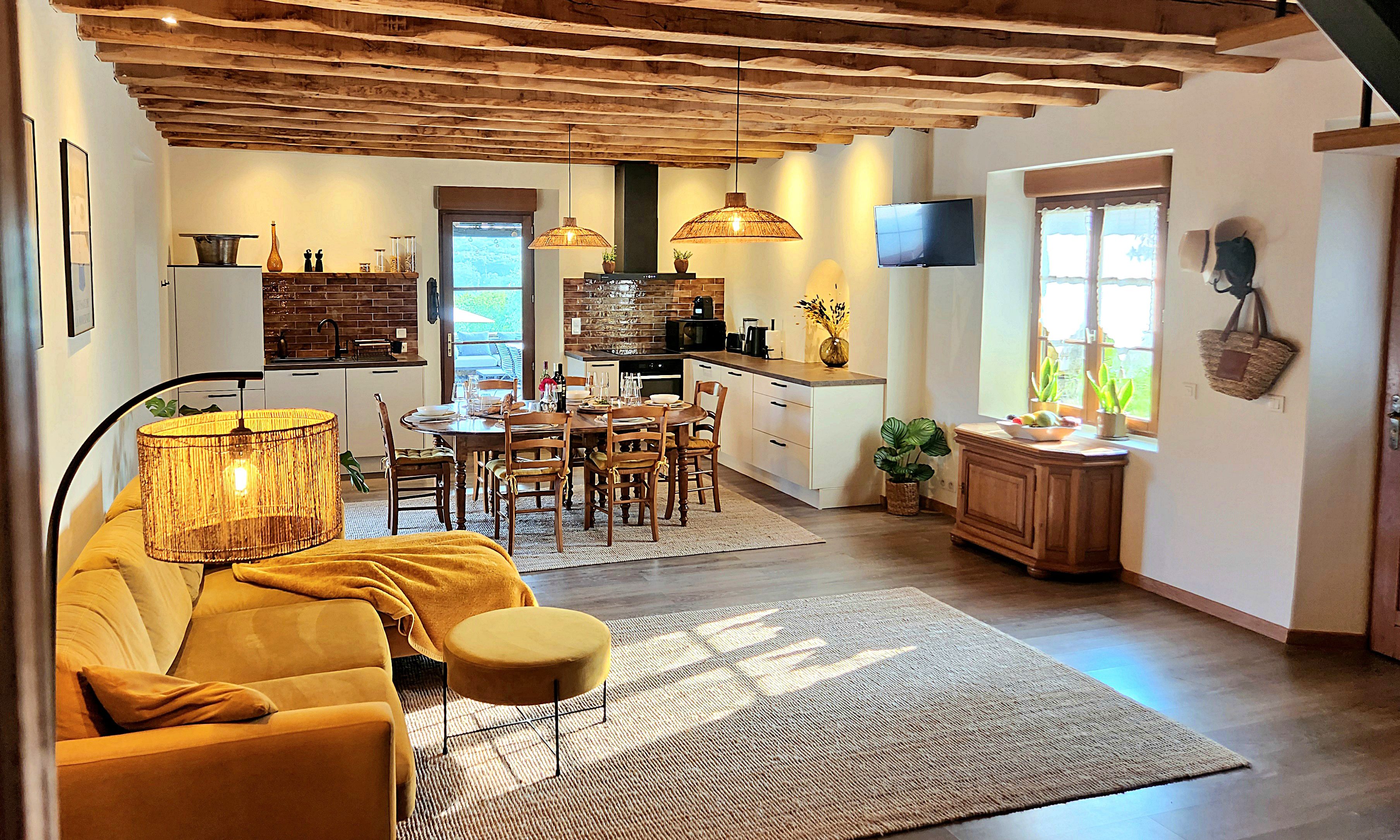 Having a dual-purpose charcoal or gas BBQ in the tranquil outdoor space is fantastic for alfresco dining! It offers flexibility for different cooking styles. A separate outside table and chairs for six to ten people (depending on the Gîte) make it perfect for gatherings. This arrangement is ideal for family meals outdoors.